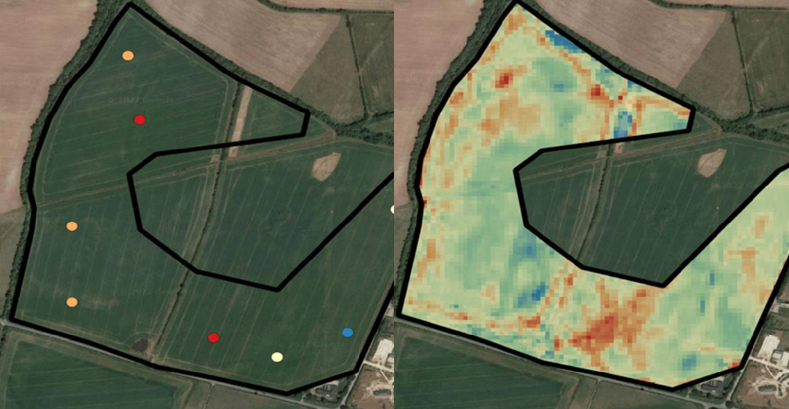 The image above show the difference between a pure soil sample report, where there is only data at the point of sampling compared to the ecometric report where our AI relates soil sample and spectral sample information as a basis of it's calculation to provide a data point every 10 metres.